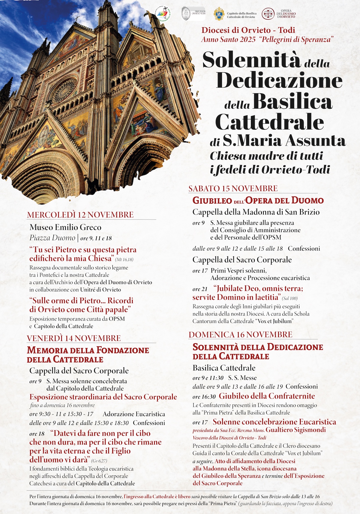 In occasione dell’Anno Santo 2025 “Pellegrini di Speranza”, la Diocesi di Orvieto-Todi, insieme al Capitolo della Basilica Cattedrale e all'Opera del Duomo di Orvieto, promuove un ricco programma di celebrazioni liturgiche, eventi culturali e momenti di preghiera in occasione della Solennità della Dedicazione della Cattedrale di Santa Maria Assunta.